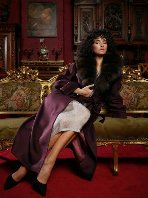 Palton lung bordo din cașmir cu guler din blană naturală
