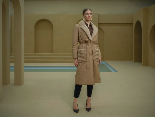 Palton lung bej din fâș cu guler din blană naturală și buzunare